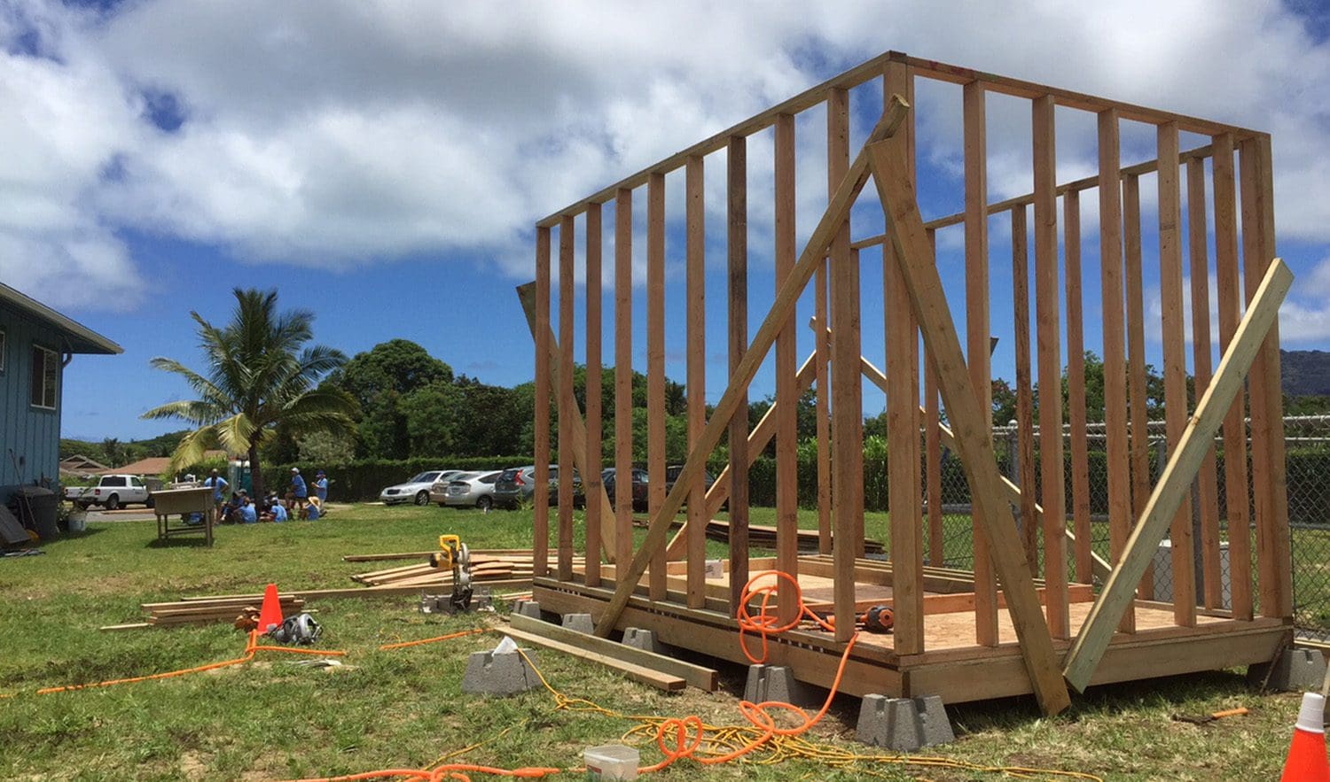The sheds are meant to accompany the five houses that were completed in December 2014 as part of Honolulu Habitat for Humanity’s Kumuhau Project. The houses were built to assist five low-income families, who otherwise would not be able to realize their dream of owning a home in Hawaii. The sheds are approximately 96-square-foot in size and made of wood with roof shingles and concrete block posts. Once completed, the sheds will be given to the five families for their use.