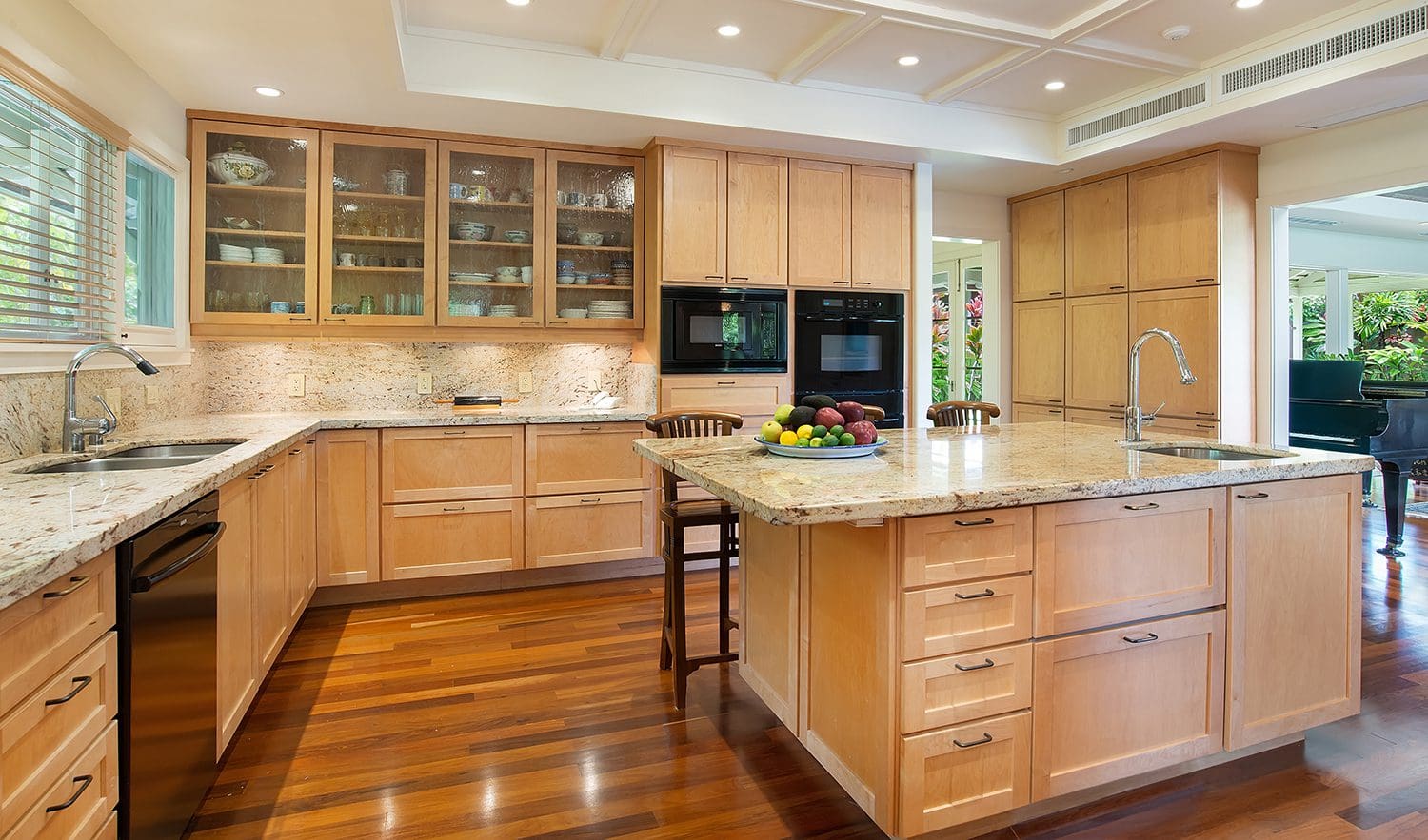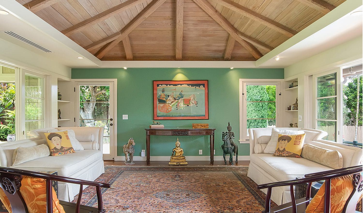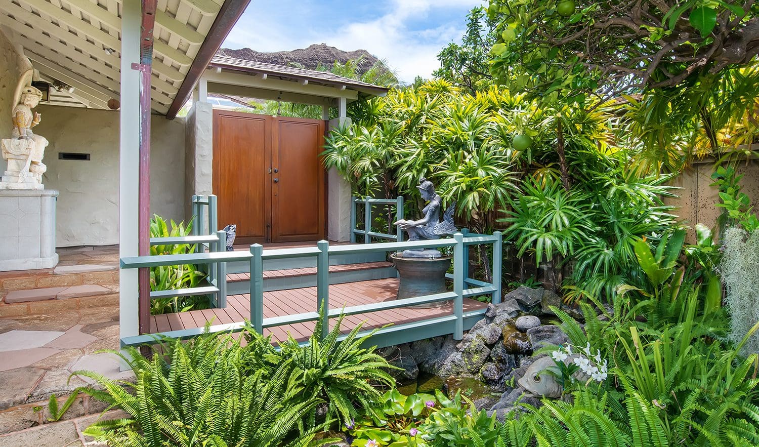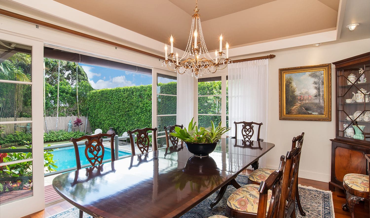 “This is a true kamaaina home, with a relaxed indoor-outdoor ambiance perfect for casual or formal entertaining with family and friends,” Oliver adds. “Many of the architectural details have been restored, keeping the Hawaiian/Asian feel of the property. Architect Nancy Peacock incorporated many of the original Asian architectural details, which complement the contemporary designer kitchen, modern baths and art lighting.”