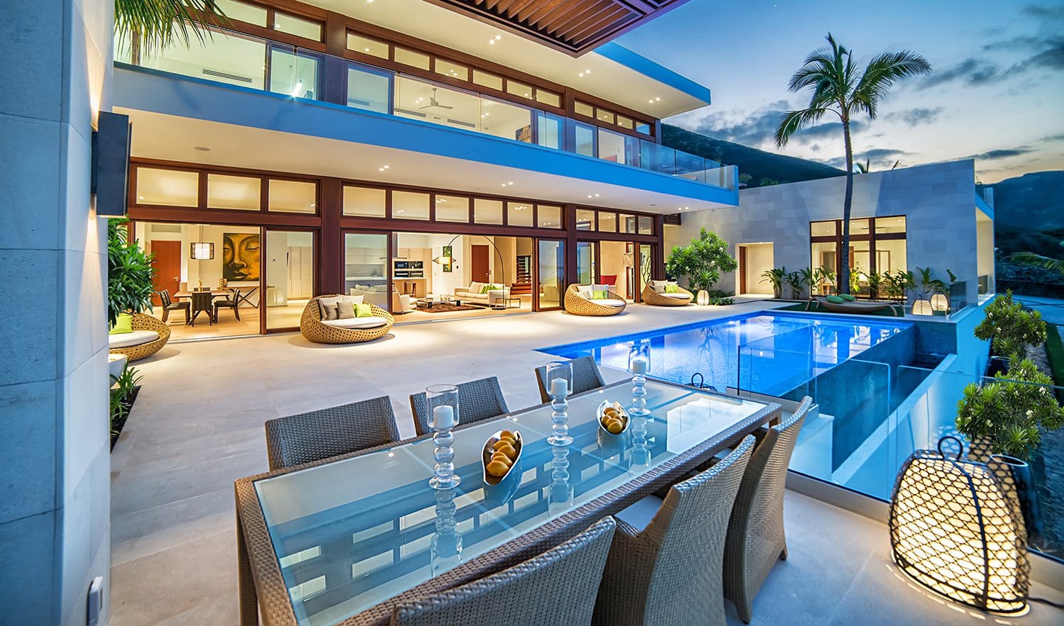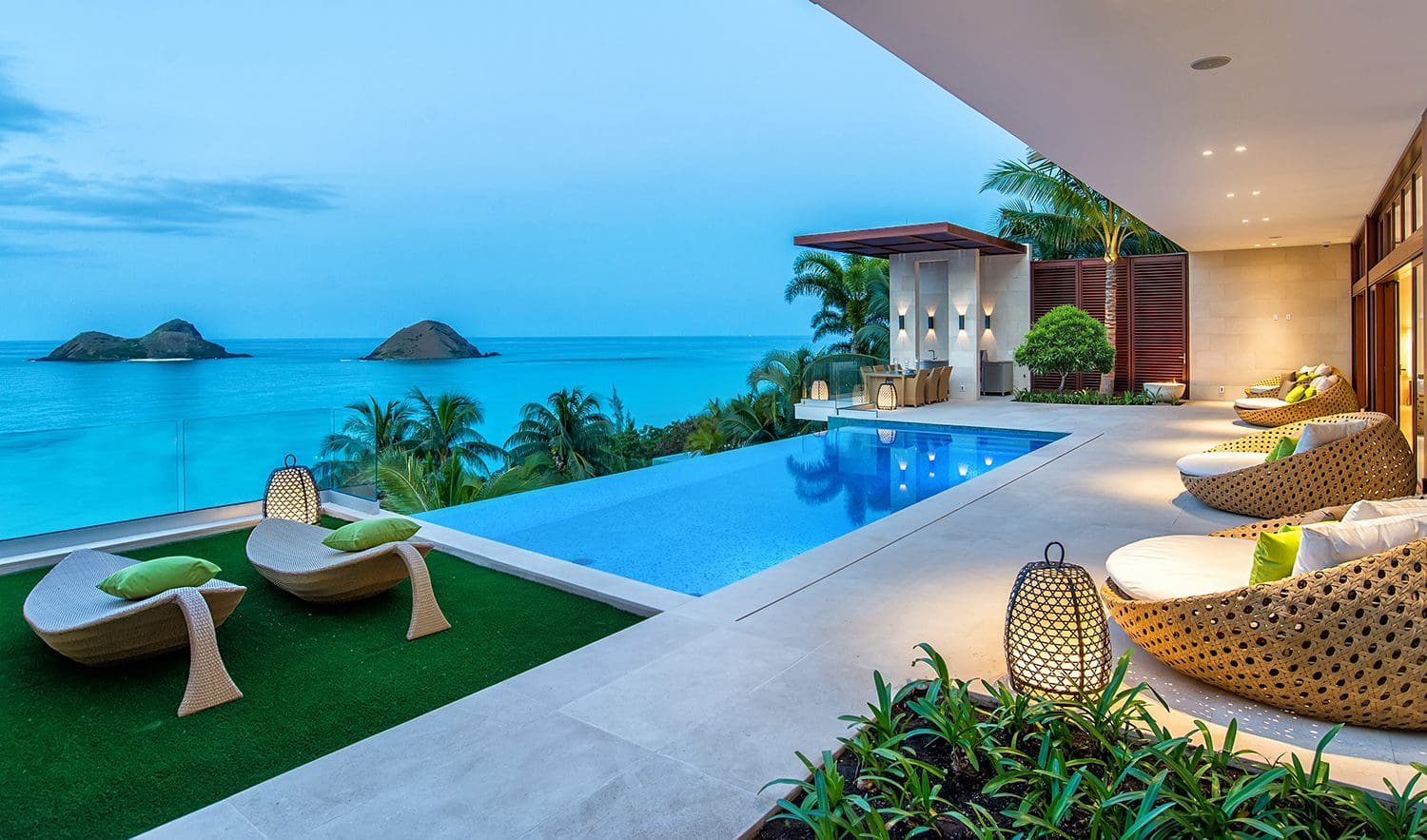 “Three lanais, an infinity-edge swimming pool with glass tiles custom made in Germany to match the natural turquoise waters and a hot tub located on a private sun deck complete with glass railings throughout for assured unobstructed views provide a natural indoor-outdoor flow while enlivening the space,” Allen adds. “Two gas fire pits with glass stones illuminate beautifully at night. The setting is perfect for entertaining or for easy-breezy solo downtime.”