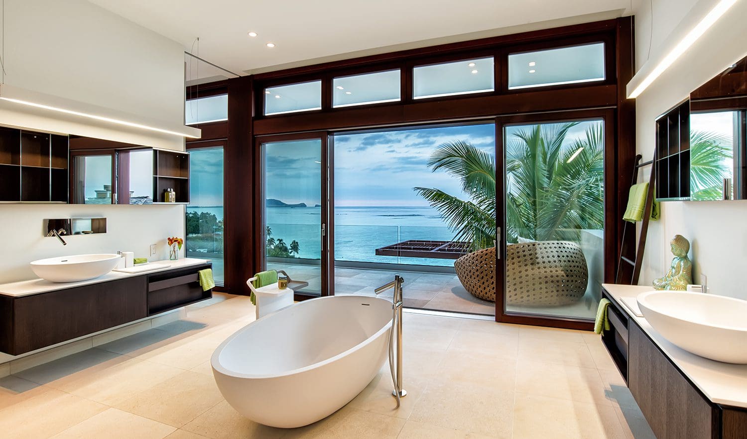 “The owners and designers are a couple from Germany and they collaborated with award-winning architect Jim McPeak to build an island masterpiece truly like no other,” says Tracy P. Allen, Vice President and Realtor Associate at Coldwell Banker Pacific Properties. “The husband, an avid kite surfer, would surf out at the Mokuluas and look up at this raw mountain, while envisioning his future masterpiece. The windows, doors, flooring, kitchen, bathrooms, lighting, stonewalls, custom wooden trellises are all imported from various places in the world.”