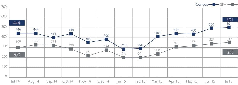 In addition to lightning-fast sales, other market stats are sizzling as well. Pending sales, which show homes and condos in escrow but haven’t closed yet, are also on the rise. Single-family pending sales are up 14.4%, from 416 a year ago to 486 last month. Condo pending sales are up 10.2% in July, from 581 in July of 2014, to 640 last month.