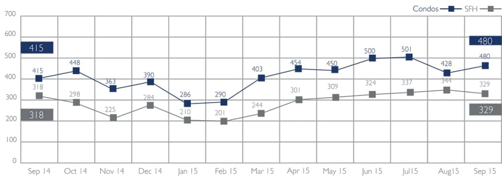 Condo sales saw a huge surge in September — 480 closed sales, compared to 415 a year ago — a 15.7% increase. Year-to-date, condo sales are up 5.1%.