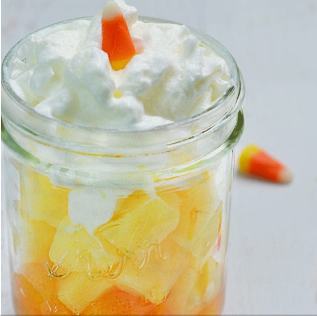 Bring fall to life with these oh-so-cute mason jar “candy corn” fruit cups. Simply fill up the jar with fresh (or packaged) mandarin oranges and slices of pineapple, top off with a dollop of whipped cream and enjoy this festive, fun and healthy snack.