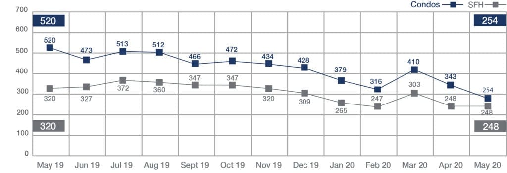 Condos prices have remained steady. The median price of a condo in May was down 4.4% — from $417,500 in May 2019, to $399,000 last month. But year-to-date, condo MSP is up 3.4% — from $415,000 during the first five months of 2019, to $$429,000 during that same five-month period in 2020.