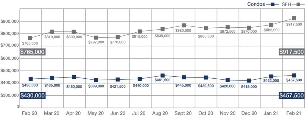 Rising more than $100,000 since February 2020, the median sales price for a single-family home broke the $900,000 mark for the first time to $917,500 — up 19.9% from $765,000 a year ago.