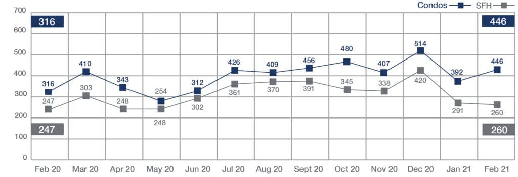 Pending sales rose dramatically for both single-family (up 32.6%) and condo (up 46%) segments. New listings declined in February — single-family down 19.3%, and condos down 2.5%, suggesting the competition among buyers will likely remain the market’s driving force.