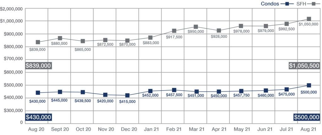 For the fourth consecutive month, single-family homes set a record median reaching $1,050,000 in August — exceeding the million-dollar mark for the first time. Except for April, each month in 2021 has reached a new record median price.