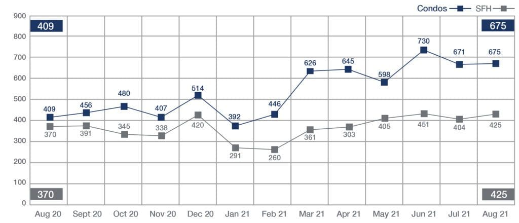 Successful buyers understand decisions must be made quickly and to put in their best offer first. Single-family buyers have to be ready as the median number of days spent on the market is 40% less than from a year ago. Currently, SF homes spend only 9 days on the market before an offer is accepted. Similarly, condo sales are taking a median of 12 days on the market — quicker by 47.8% from August 2020. Last month, 64% of SF homes sold above the asking price, and 41% of condos closed above the original asking price.
