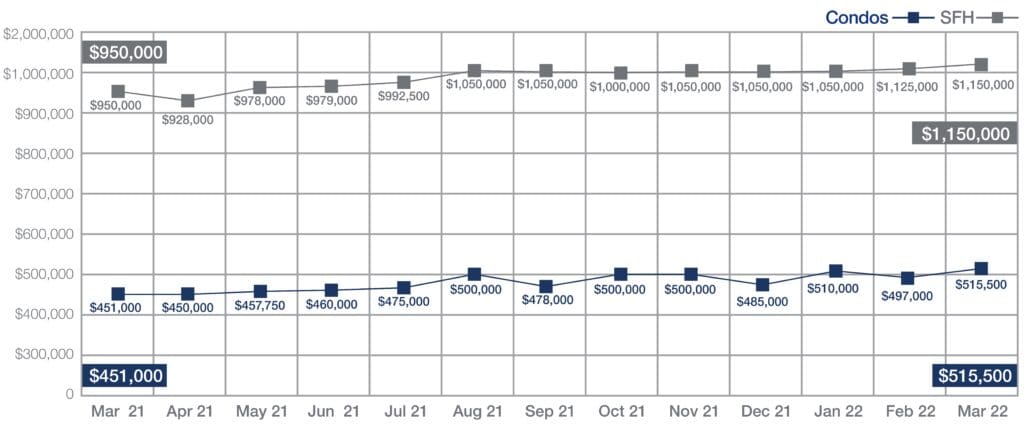 The first quarter of 2022 closed out March with new record median sales prices for single-family homes and condos at $1,150,000 and $515,500, respectively.