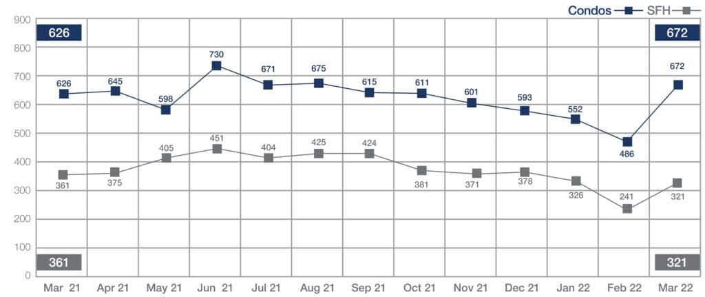 March condo sales outpaced March 2021 sales by 7.3% — up from 626 to 672 last month.