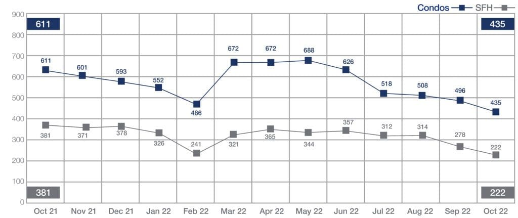 Buyer activity continues to slow. Closed sales dropped 41.7% for single-family homes, and condos fell 28.8% in October, year-over-year. For single family homes, the number of sales in October 2021 was 381, and last month plunged to 222. Condo sales were 611 a year ago, and last month fell steeply to 435.