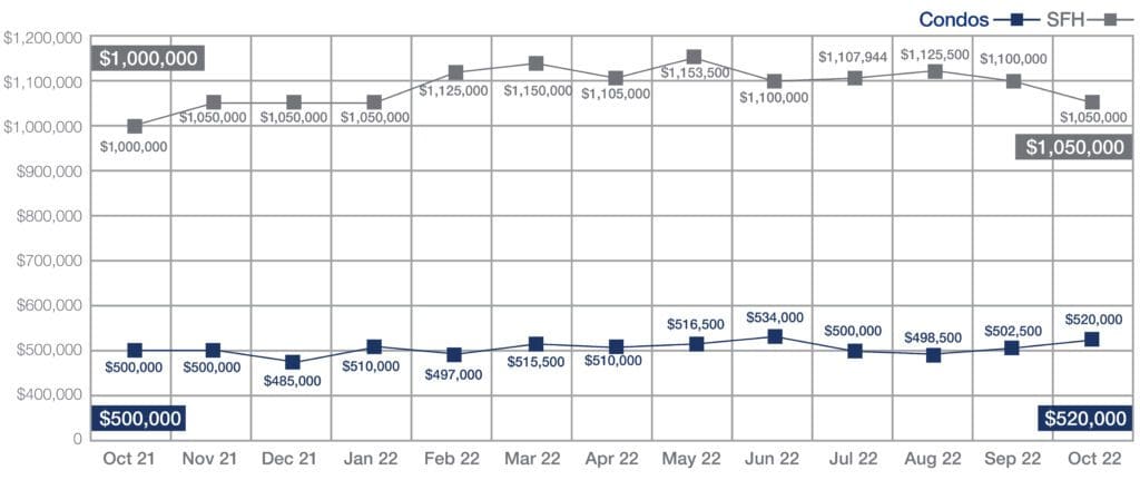 The MSP of a single-family home was up 5% from October 2021 — from $1 million to $1,050,000 — and marked the 15th consecutive month where the median was at $1 million or more. The record monthly high of $1,153,500 was set in May.