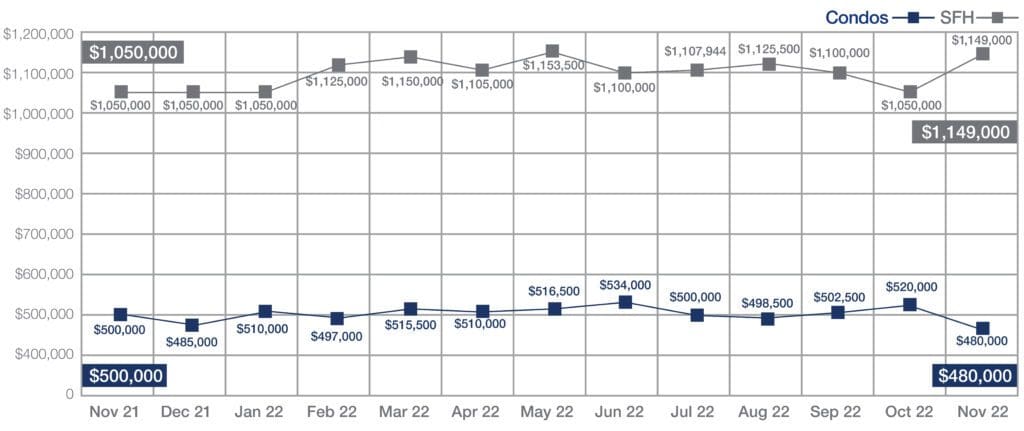 The median sales price of a single-family home was $1,149,500, a gain of 9.5% from November 2021 when the MSP was $1,050,000, marking the 16th consecutive month over $1 million.