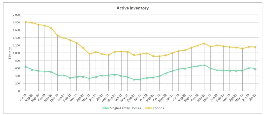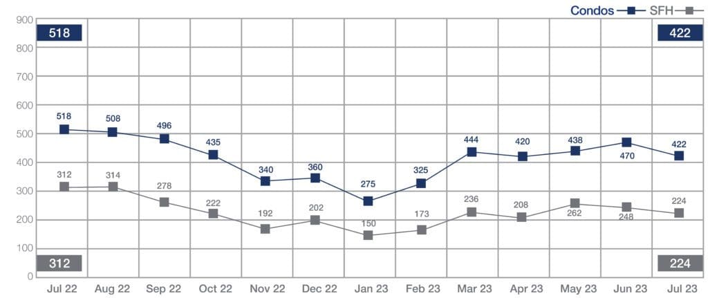 Single-family home sales dropped from 312 homes closed in July 2022 to 224 closings last month. Condo sales were also down from 518 in July 2022 to 422 last month.