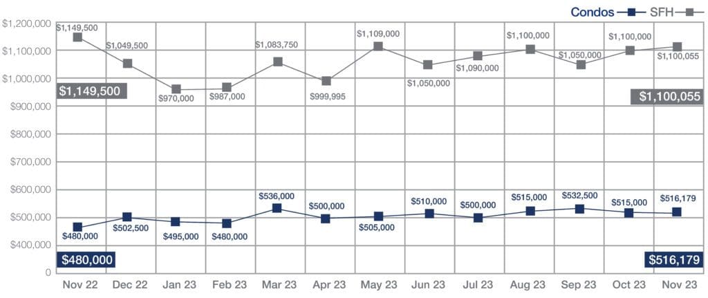 Notably, single-family home prices held steady for the better part of the year, but fell in November, from $1,149,500 in November 2022 to $1,100,055 last month — a 4.3% drop.