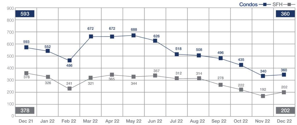For the 12 months of 2022, the total number of closed sales was also down from 2021 — down 23.2% in the SF home segment, and down 11.8% in the condo segment.