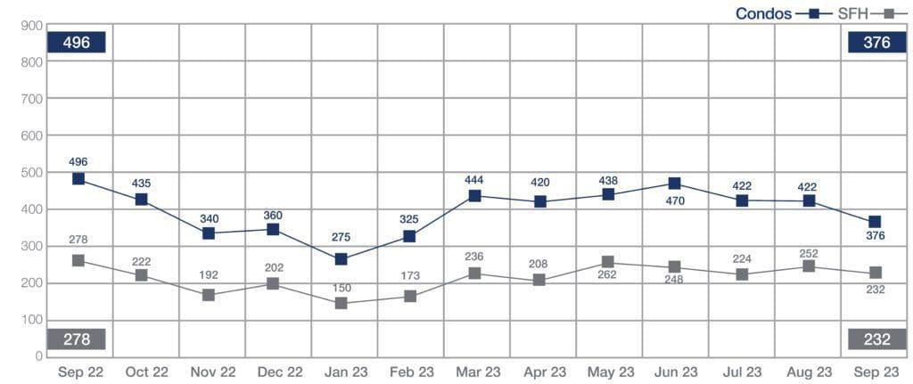 Compared to September 2022, fewer sales closed on Oahu last month. Single-family home closings were down 16.5% — from 278 in September 2022 to 232 last month. Condo sales decreased from 496 a year ago, to 376 last month — a 24.2% decline.