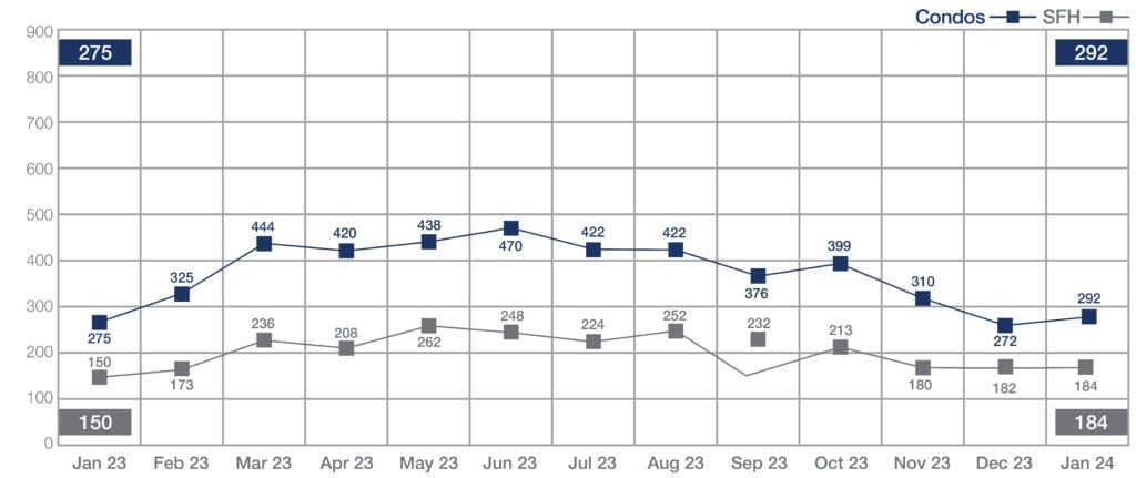 Sales volume is up. Compared to January 2023, single-family home sales were up 22.7%, and condo sales were up 6.2%.