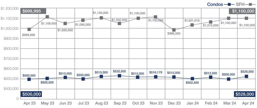 According to the latest data, the median sales prices of both single-family homes and condos have increased. In April, the median sales price of a single-family home was $1,100,000 — up 10% from a year ago, when the MSP of a SF home was $999,995.