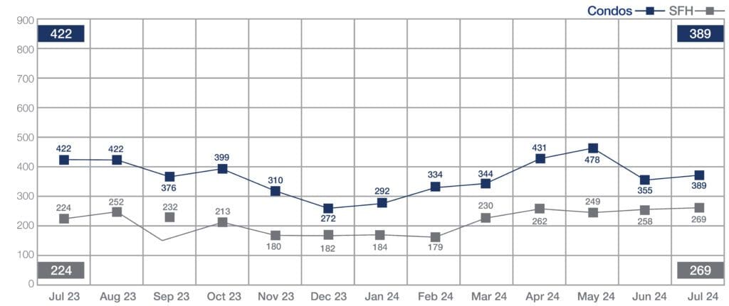 Sales volume data was mixed in July. Single-family sales shot up 20.1% — from 224 in July 2023 to 269 homes closed last month, while condo sales dropped 7.8% — from 422 in July 2023 to 389 last month.