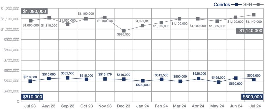 In July, the median price of a single-family home increased by 4.6% to $1,140,000 from $1,090,000 in July 2023. Additionally, the median price of a condo in July also rose by 1.8% to $509,000 from $500,000 in 2023.