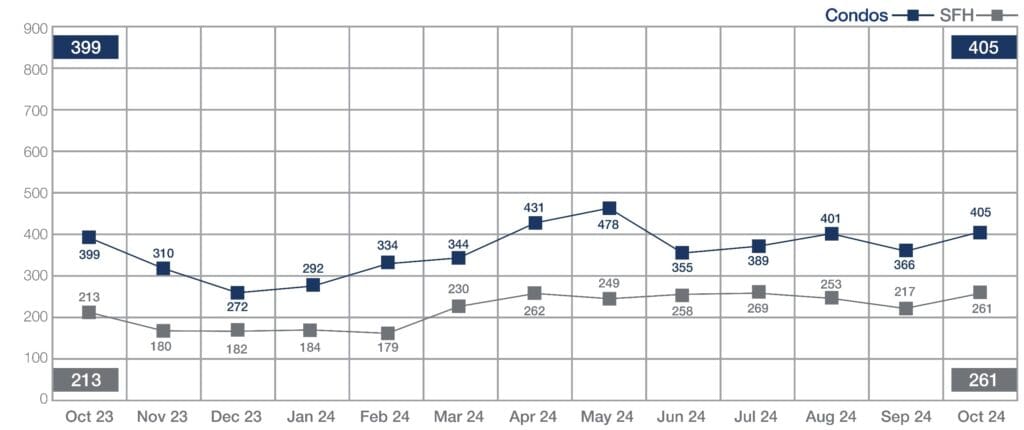Condos are also up year-over-year and year-to-date. The condo MSP in October was $525,000 — up 1.9% from $515,000 in October 2023. YTD, the condo MSP is $510,000 — up 0.6% from $507,000 this time last year.
