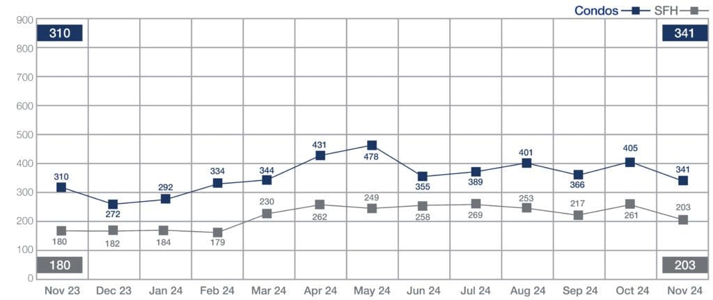 In the condo market, more than 50% of November sales occurred in the $300,000 to $599,999 price range. Sales volume in this price range increased 25.5% from a year ago with 182 sales compared to 145 in November 2023.