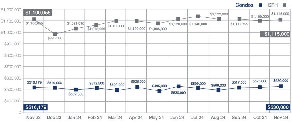 In November, the median price of a single-family home increased by 1.4% — from $1,100,055 in November 2023, to $1,115,000 last month. Year-to-date, and with one month to go in 2024, the MSP of a single-family home is up 3.8% from $1,060,000 at this point last year, to $1,100,000 currently— tracking toward the all-time, highest Annual MSP. (The current record high was $1,105,000, set in 2022.)