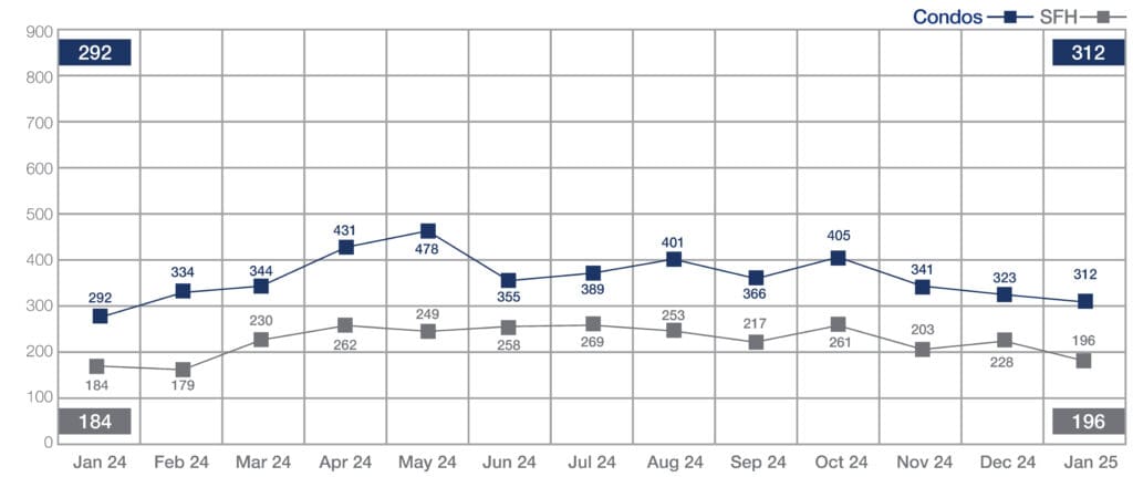 Across all single-family home sales, 23% closed above the original asking price, nearly identical to last year. In the condo segment, the $1 million-and-up price range accounted for a greater share of the sales, up 125% from 16 sales a year ago, to 36 sales last month. Ten percent of condo transactions closed above asking price, compared to 17% in January 2024.