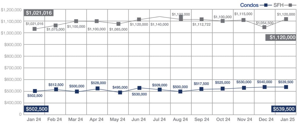 Single-family home MSP gained 9.7% — up from $1,021,016 in January 2024 to $1,120,000 last month. Condo prices are up during the same period from $502,500 to $539,500, just shy of the record-high monthly MSP of $540,000 set in December.