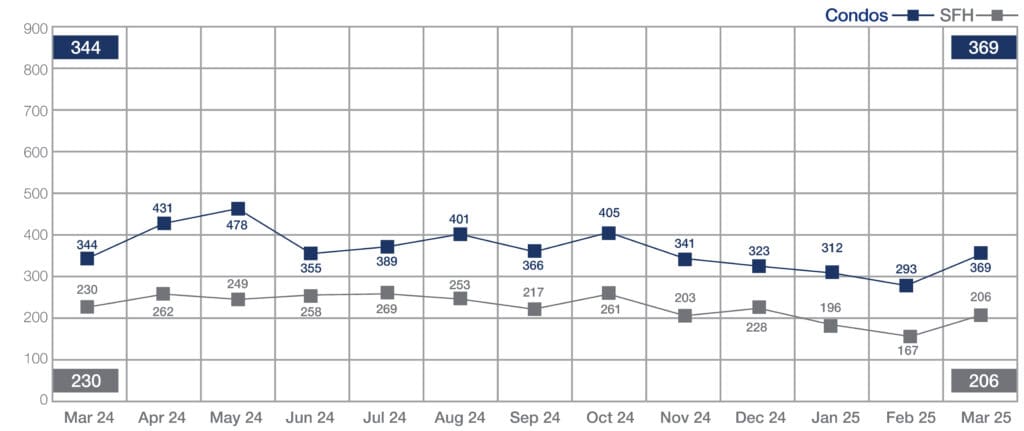 Condo sales, conversely, were up. Year-over-year, sales activity gained 7.3% — from 344 closings in March 2024, to 369 last month. First-quarter condo sales volume held nearly even, up 0.4% from 970 a year ago, to 974 at the end of March.