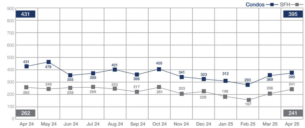 Sales activity slowed in April in both market segments. The number of single-family homes closed sales were down 8%, and condo sales also fell 8.4%, compared to April 2024.