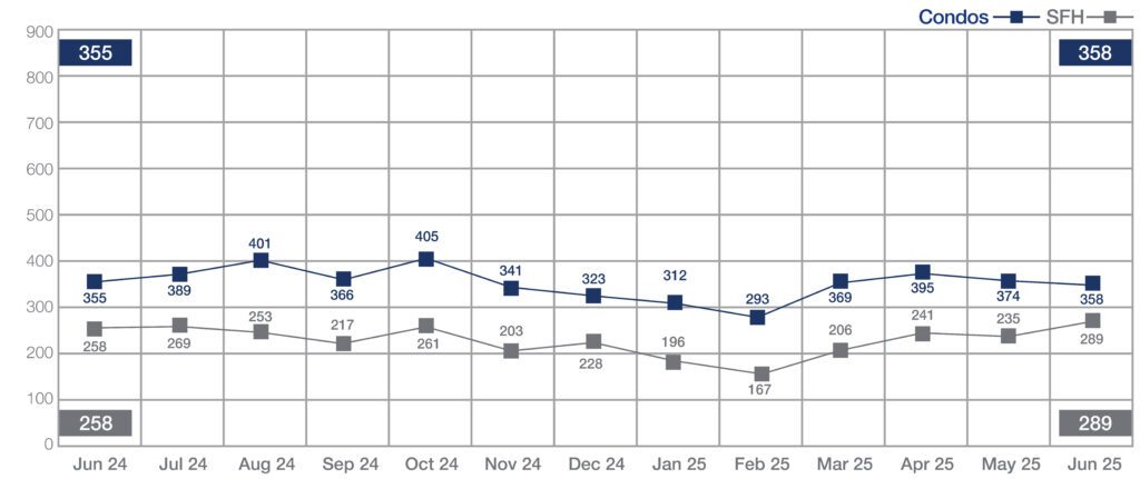 Condominium sales were relatively flat, up just 0.8% year-over-year, with 358 units sold in June 2025 compared to 355 in June 2024. However, year-to-date condo sales show a more noticeable decline—down 6% from 2,234 units in the first half of 2024 to 2,101 this year.