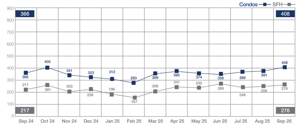 New listing activity slowed in September, with single-family listings down 6.0% to 330, while condo listings edged up 1.1% to 638. Quarterly new listings declined slightly for both segments, though year-to-date totals remain ahead—up 7.0% for single-family homes and 12.0% for condos.