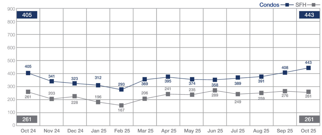Single-family home sales were essentially unchanged year-over-year, with 261 transactions compared to 261 last October. Condominium sales rose 9.4%, increasing from 405 to 443 units. Pending sales activity showed slight improvement, with single-family contracts up 4.0% and condo contracts up 1.3%.